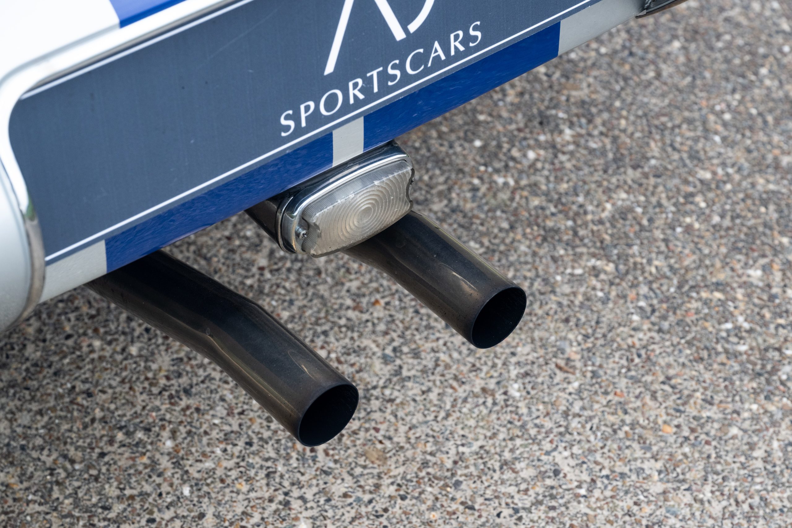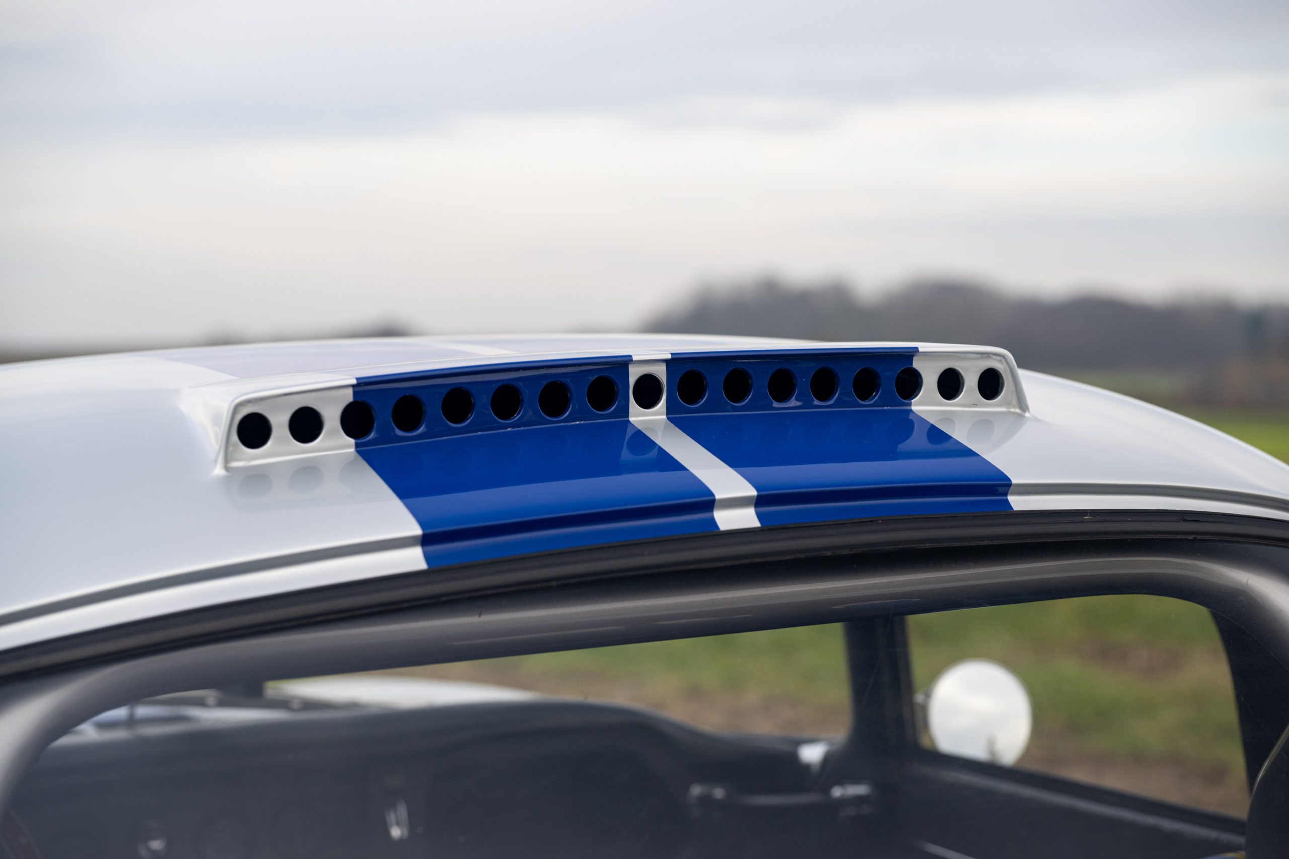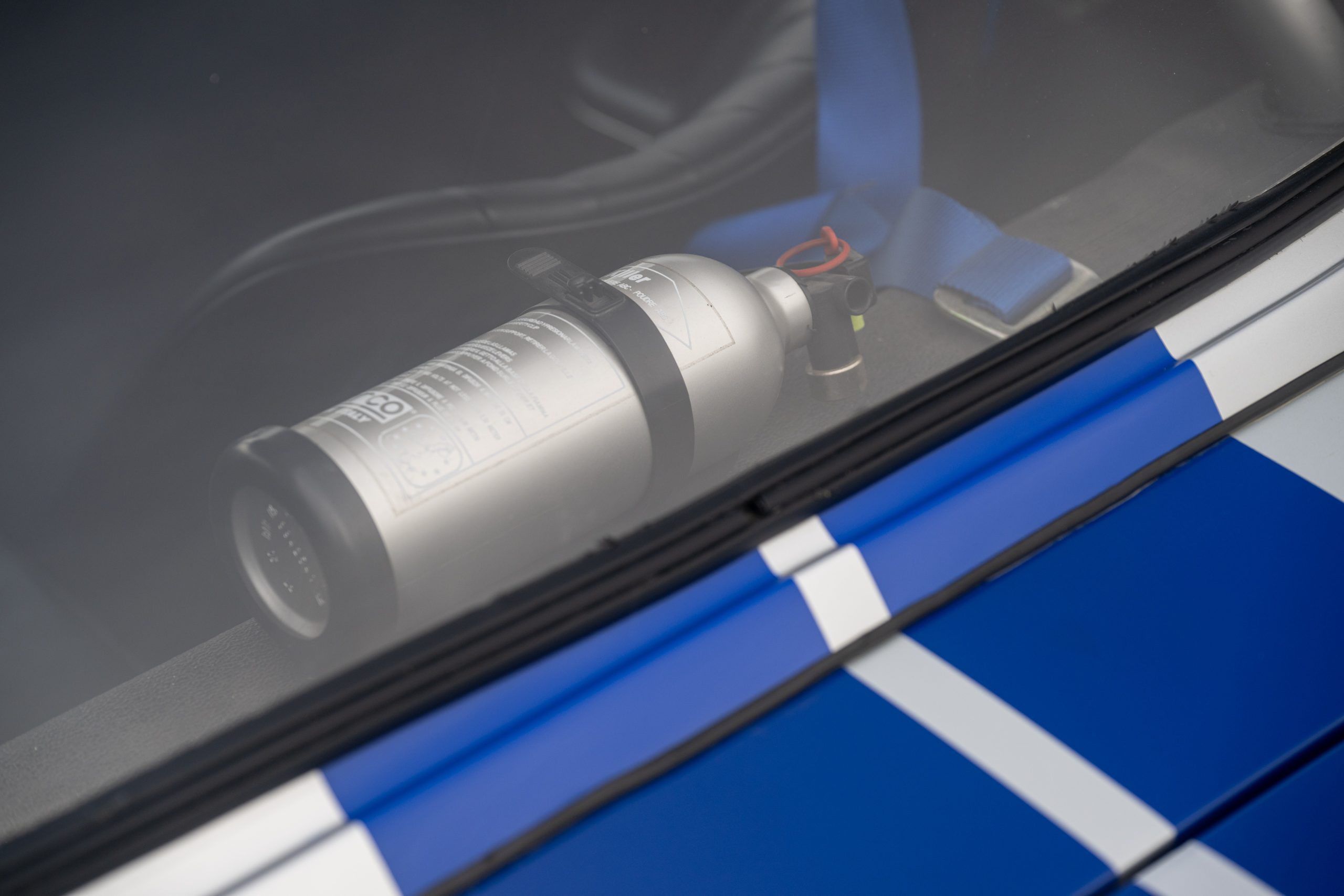 Finished in Silver Grey with blue racing stripes and a black interior, the car features Cobra racing seats and a removable steering wheel, reinforcing its purposeful and sporting character.