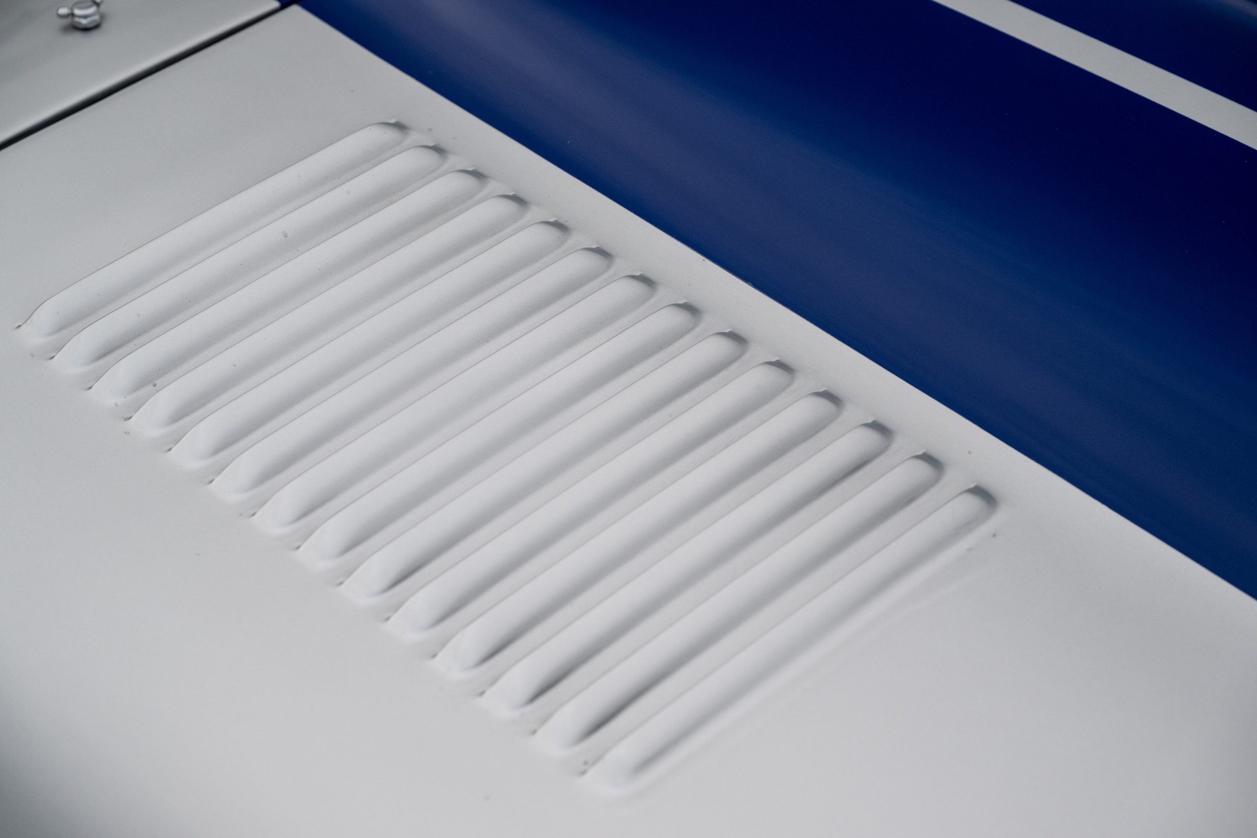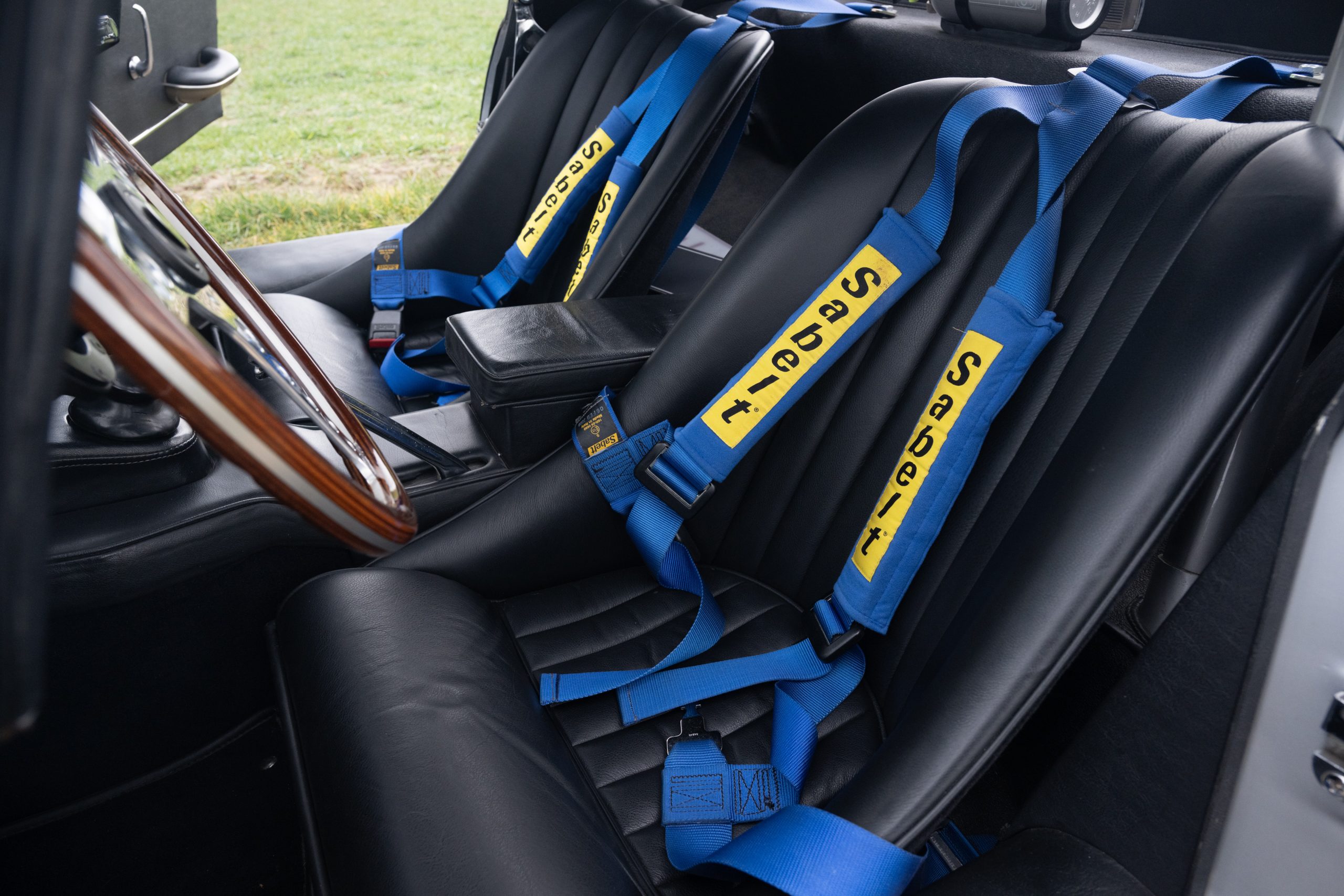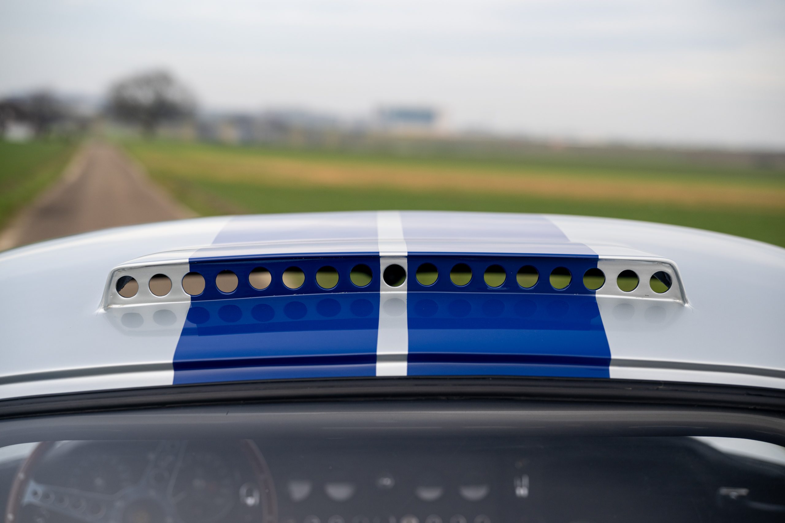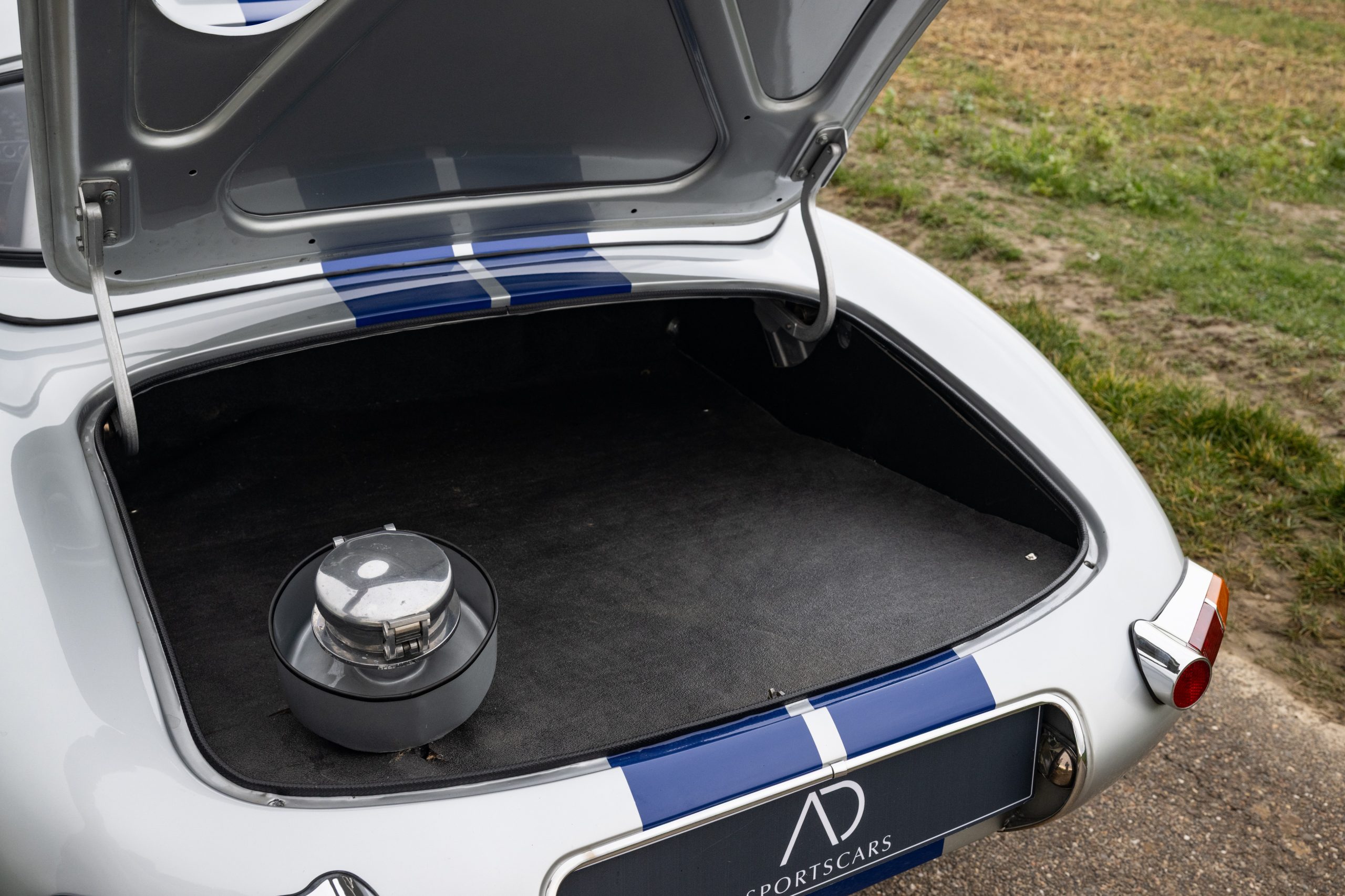 Finished in Silver Grey with blue racing stripes and a black interior, the car features Cobra racing seats and a removable steering wheel, reinforcing its purposeful and sporting character.