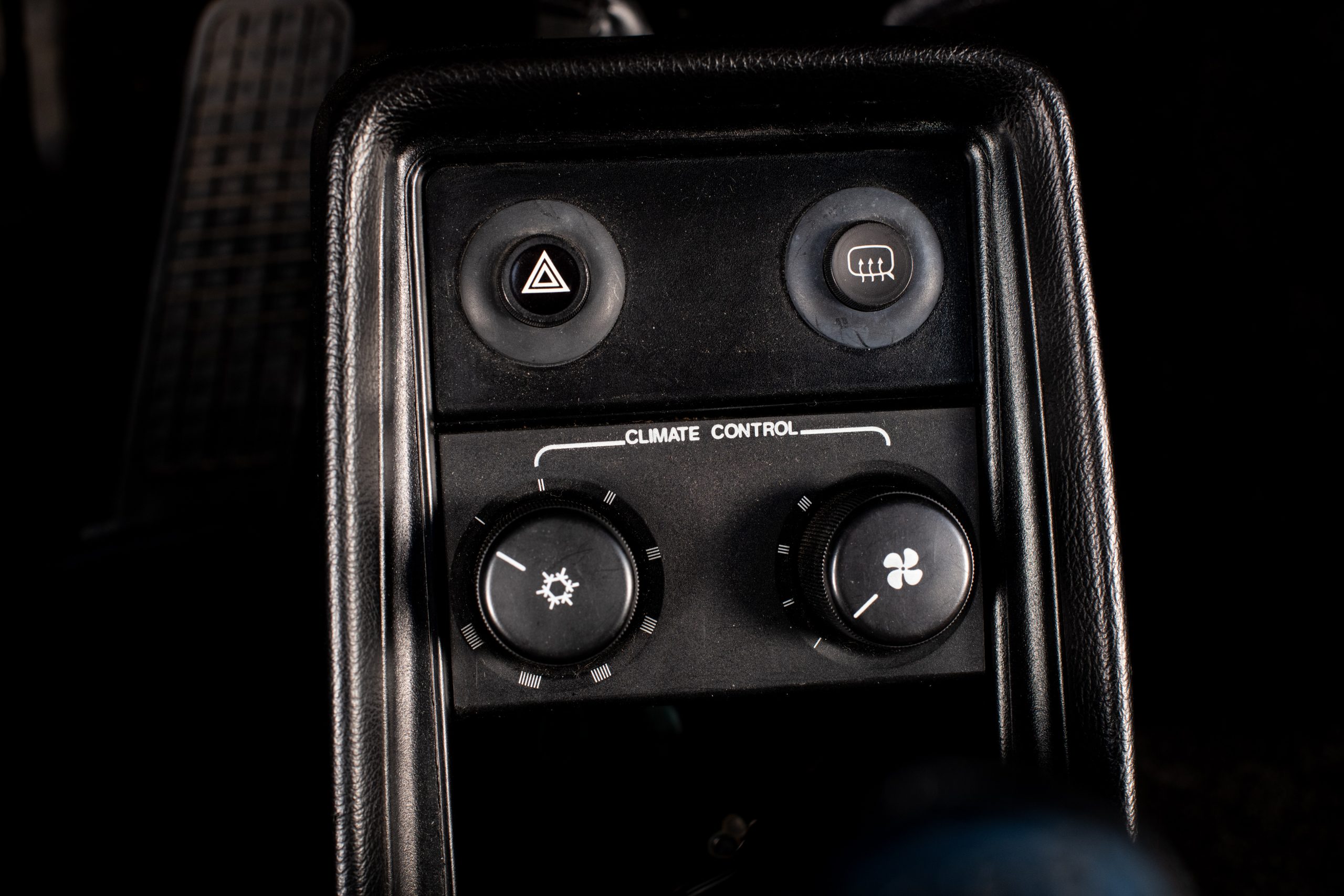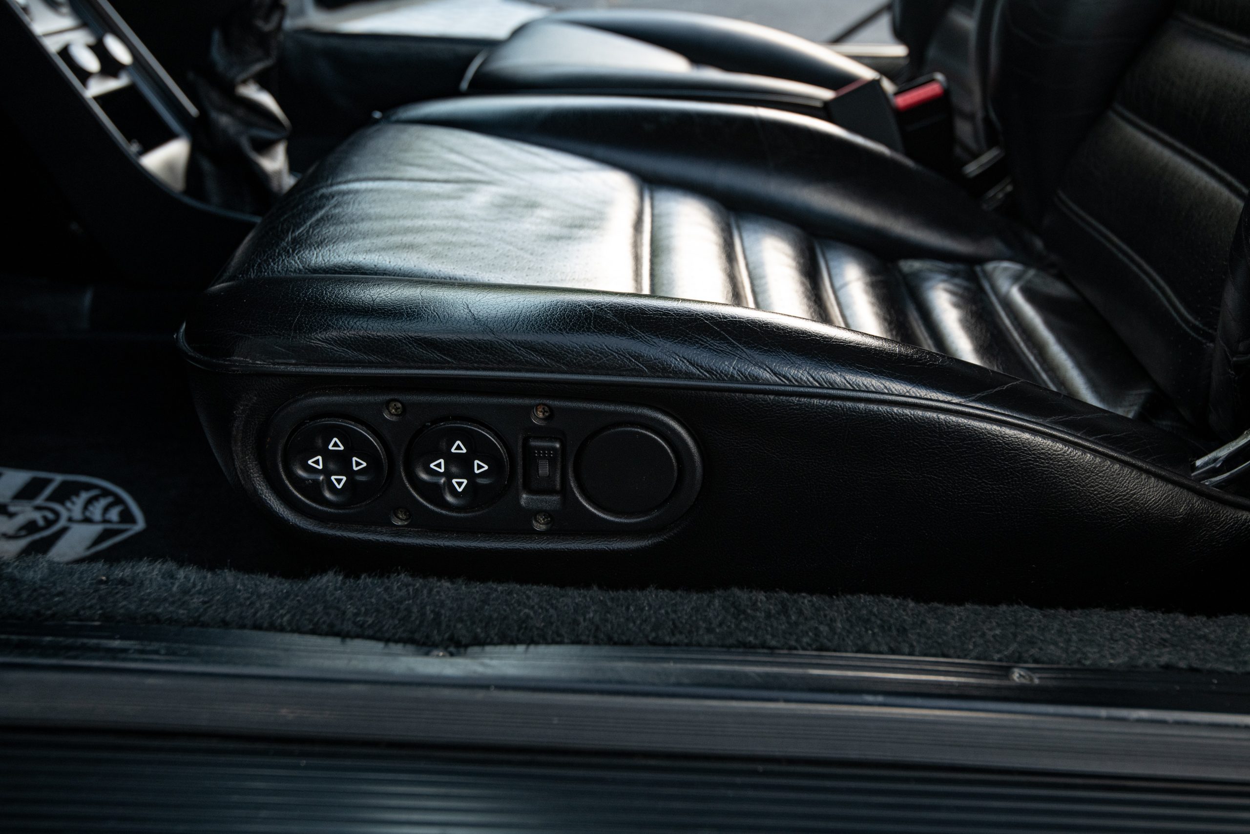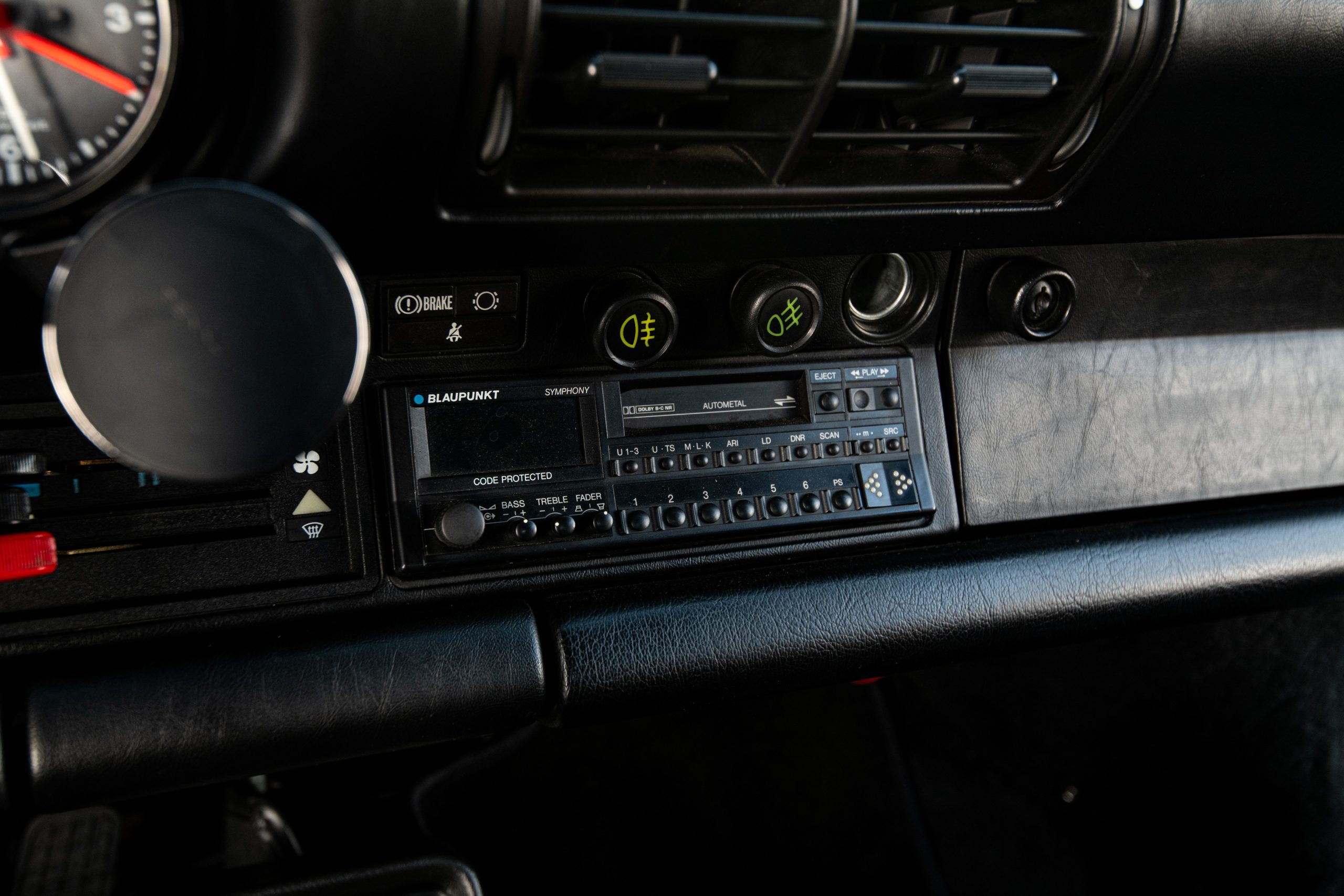 The interior is entirely original, featuring black leather seats, factory air conditioning, electric 8-way seats, and heated seats on both sides. A Blaupunkt Symphony radio and Porsche alarm system are also present. All instruments and electrical systems operate correctly.